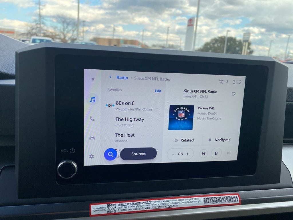- 8-in. Toyota Audio Multimedia display with 6-speaker audio system, wireless Apple CarPlay® [carplay_wireless] & Android Auto™ [android_auto_wireless] compatibility, SiriusXM® 3-month trial subscription. [siriusxm] See toyota.com/connected-services for details.