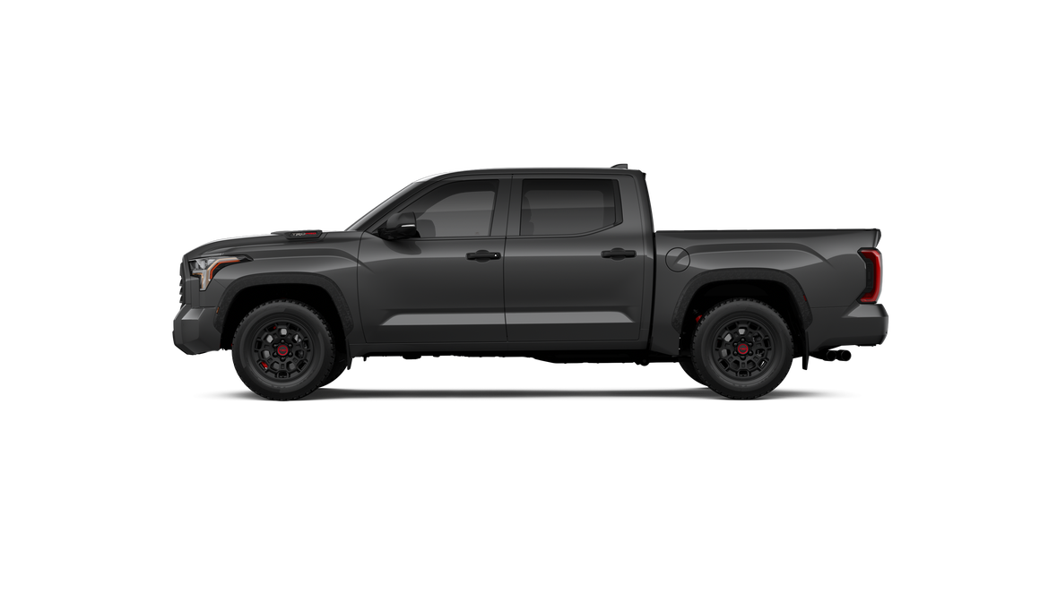 - "TRD PRO" hood badge; black door handles; black window molding and mirror caps; black technical-camo-grained tailgate spoiler and overfenders with marker lights