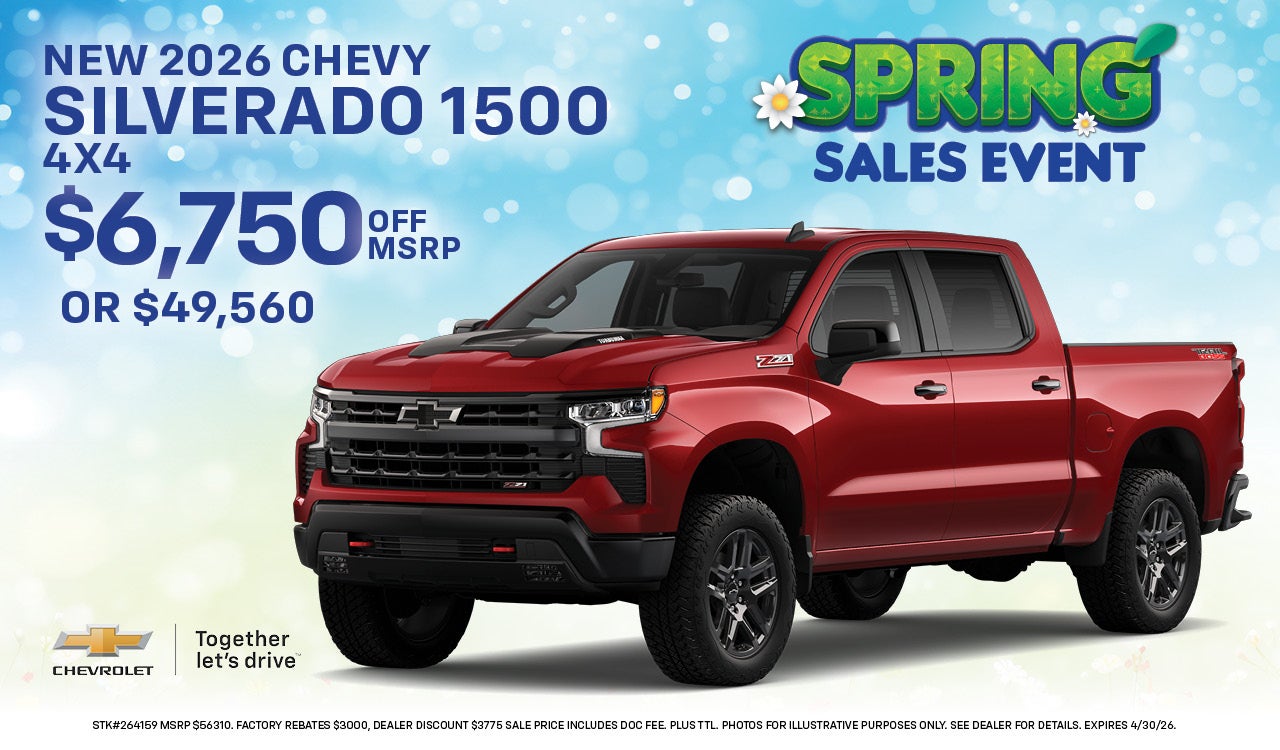 New 2026 Silverado 4X4 $6750 off MSRP or $49,560 STK#264159 MSRP $56310. Factory Rebates $3000, Dealer discount $3775 Sale Price includes doc fee. Plus TTL. Photos for illustrative purposes only. See dealer for details. Expires 4/30/26.