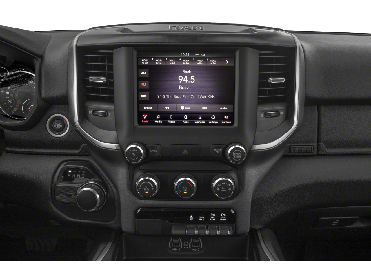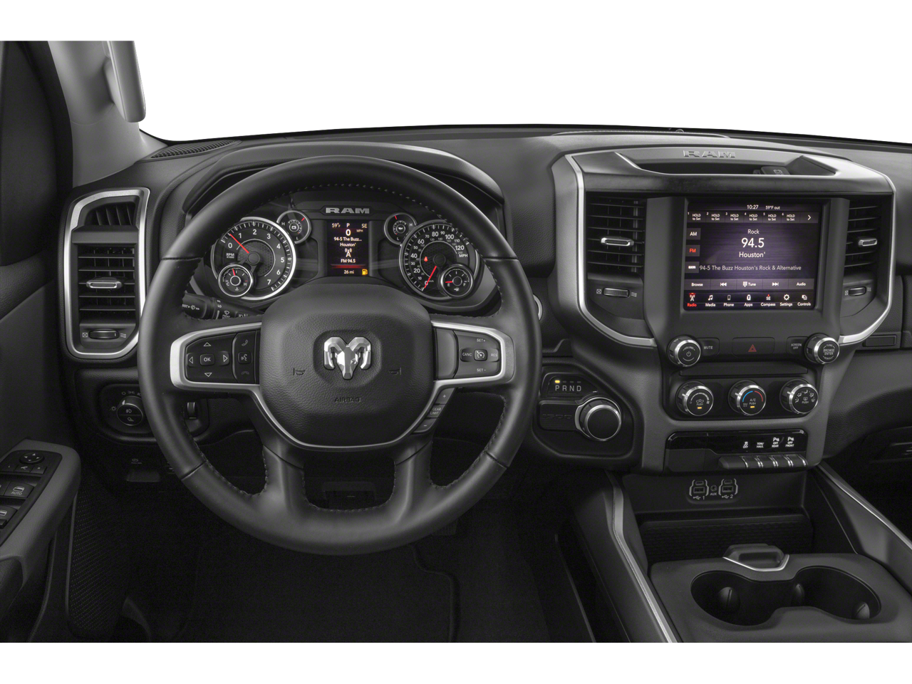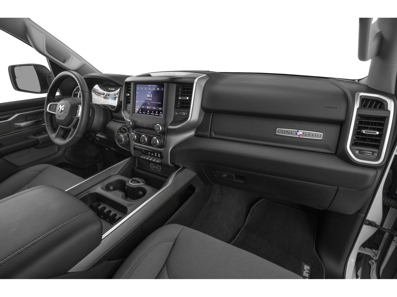 Big Horn Level 2 Equipment Group (115V Auxiliary Power Outlet, 115V Auxiliary Rear Power Outlet, 2 USB Full Function/Charge Only Media Hub, 2nd Row In Floor Storage Bins, 400W Inverter, Air Conditioning ATC w/Dual Zone Control, Auto-Dimming Rear-View Mirror, Big Horn IP Badge, Black Premium Power Mirrors, Class IV Receiver Hitch, Dampened Tailgate, Foam Bottle Insert (Door Trim Panel), Glove Box Lamp, Heated Front Seats, Heated Steering Wheel, ParkSense Front/Rear Park Assist w/Stop, Power 4-Way Driver Lumbar Adjust, Power 8-Way Driver Seat, Power Adjustable Pedals, Radio: Uconnect 4 w/8.4 Display, Rear Dome w/On/Off Switch Lamp, Rear Power Sliding Window, Rear Window Defroster, Security Alarm, SiriusXM Satellite Radio, Sun Visors w/Illuminated Vanity Mirrors, and Universal Garage Door Opener), Night Edition (3 Rear Seat Head Restraints, 4 Way Front Headrests, Anti-Spin Differential Rear Axle, Auto-Dimming Exterior Driver Mirror, Black Exterior Truck Badging, Black Headlamp Bezels, Black Interior Accents, Body Color Door Handles, Body Color Exterior Mirrors, Body Color Front Bumper, Body Color Premium Power Mirrors, Body Color Rear Bumper w/Step Pads, Bucket Seats, Deluxe Cloth Bucket Seats, Dual Exhaust w/Black Tips, Exterior Mirrors Courtesy Lamps, Exterior Mirrors w/Memory, Front Seat Back Map Pockets, Full Length Floor Console, Grille Surround 1 Black Texture 2 Black, Manual Adjust 4-Way Front Passenger Seat, Power-Folding Mirrors, Rear 60/40 Folding Seat, and Wheels: 20 x 9.0 Premium Paint/Polished), Off Road Group (E-Locker Rear Axle, Front Extra HD Shock Absorbers, Hill Descent Control, Off Road Decals, Rear Extra HD Shock Absorbers, and Tow Hooks), Quick Order Package 27R Lone Star (Regional), 3.21 Rear Axle Ratio, 4-Wheel Disc Brakes, 48V Belt Starter Generator, 6 Speakers, 9 Amplified Speakers w/Subwoofer, ABS brakes, Air Conditioning, Alloy wheels, AM/FM radio, Brake assist, Bumpers: chrome, Cloth Bench Seat, Compass, Delay-off headlights, Driver door bin, Dual front impact airbags, Dual front side impact airbags, Electronic Stability Control, Engine Calibration Flash (DISC), Front anti-roll bar, Front Center Armrest w/Storage, Front fog lights, Front reading lights, Front wheel independent suspension, Fully automatic headlights, GPS Antenna Input, Heated door mirrors, Illuminated entry, Leather steering wheel, Low tire pressure warning, Manufacturer's Statement of Origin, Occupant sensing airbag, Outside temperature display, Overhead airbag, Overhead console, Panic alarm, ParkView Rear Back-Up Camera, Passenger door bin, Passenger vanity mirror, Power door mirrors, Power steering, Power windows, Radio data system, Radio: Uconnect 3 w/5 Display, Rear anti-roll bar, Rear seat center armrest, Rear step bumper, Remote keyless entry, Remote Start System, Speed control, Split folding rear seat, Steering wheel mounted audio controls, Tachometer, Telescoping steering wheel, Tilt steering wheel, Traction control, Trailer Brake Control, Trip computer, Variably intermittent wipers, Voltmeter, and Wheels: 18 x 8 Cast-Aluminum Painted.