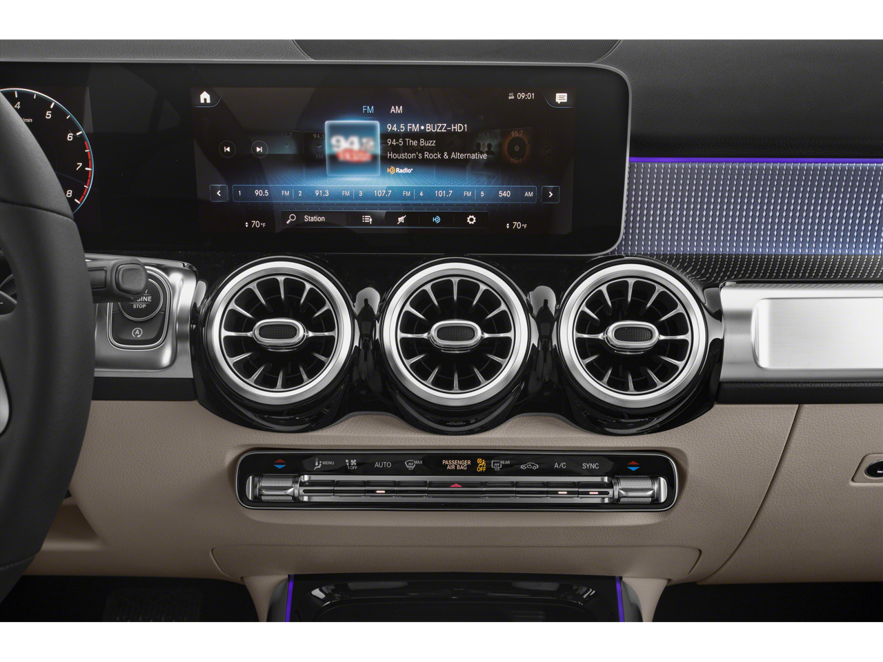 - Radio: Mercedes-Benz User Experience (MBUX) -inc: 7" touchscreen multimedia display, voice control including natural language understanding and keyword activation (Hey Mercedes), Bluetooth® connectivity, Mercedes me connect services w/trial period, 4 USB-C ports (note: adapter will be required to connect to USB-A devices)